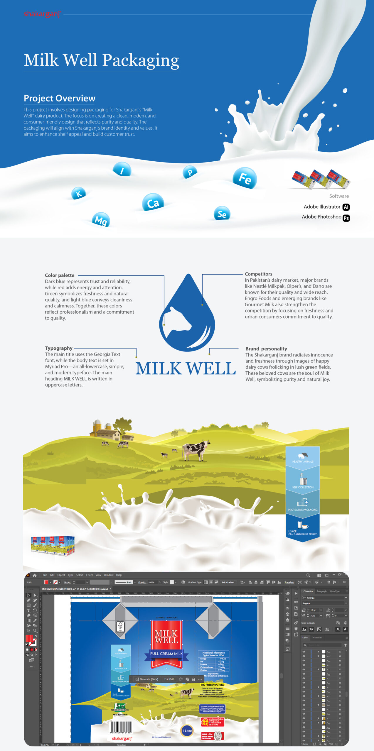 The Milk Well packaging design combines clean aesthetics with vibrant illustrations to reflect purity, nutrition, and quality. With a focus on trust and freshness, the design uses bold blue and green tones, farm imagery, and a splash motif to capture the essence of wholesome dairy. The layout is thoughtfully crafted to highlight key benefits and brand values, creating a strong shelf presence and consumer appeal.
